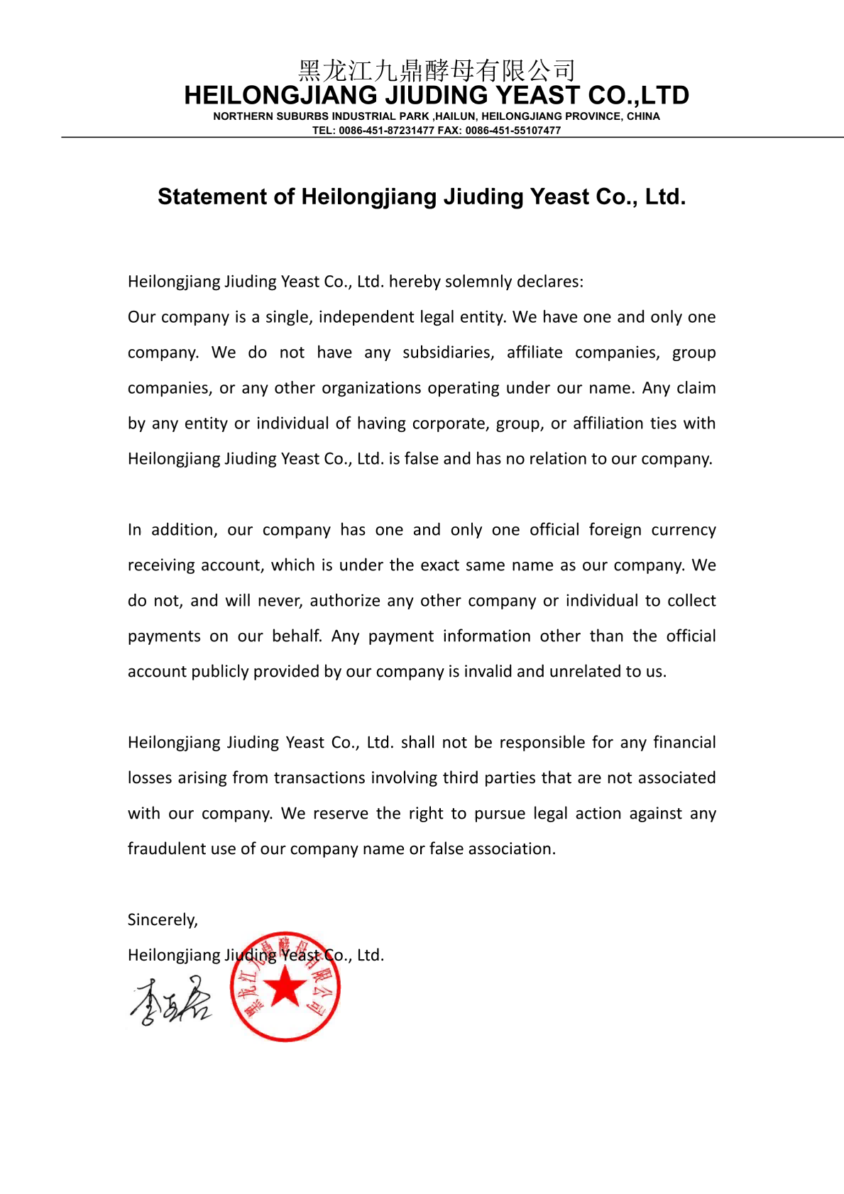 Statement of Heilongjiang Jiuding Yeast Co., Ltd.